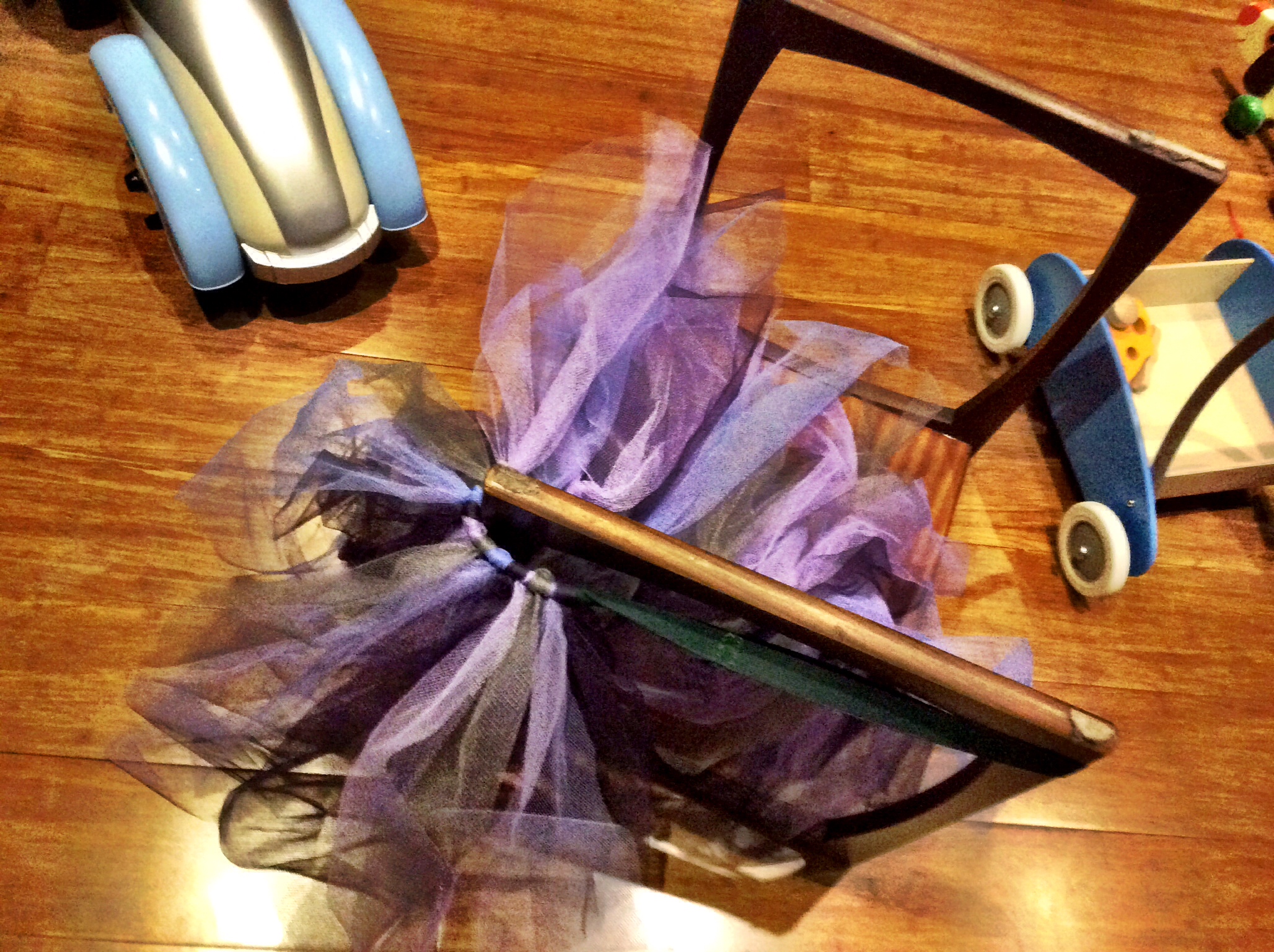 Find something to use as a frame for making the tutu: you want the elastic to be tight enough not to fall down but not stretched too much. I started off with the piano stool but that was actually a bit too big. The handle of Arthur’s walker was a much better size!