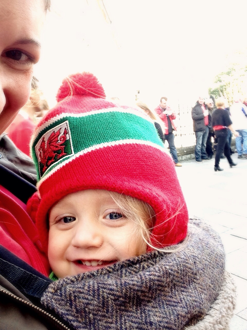 There were at least two other babywearing mums there this time too: one who even made it on to the big screen, and another who I chatted to as we walked down the stairs after what was a undoubtedly successful game for Wales. It always impresses me how civilised the city is on match days. The whole place closes down to traffic, and I’ve never seen any trouble amongst the swarms of pedestrians who take over.