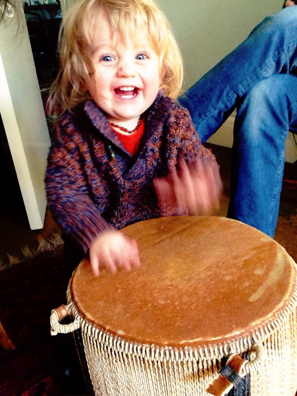 It was pretty special taking Arthur to Grampa’s house. I have been going to that house since I was a baby, and it’s remained a reassuring constant with all the different family homes we’ve had over the years. Whilst he wasn’t too impressed with our conversation, Arthur was very taken by the drum that has stood on Grampa’s stairs for as long as I can remember. He and Granny brought it back from Africa having lived there for over twenty years, and I have fond memories of playing it with similar enthusiasm with my brothers and cousins.